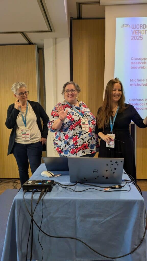Anche nel 2025 devo elogiare Gloria Liuni e Dennis Ploetner: con Gloria ormai mi sento spessissimo sia come supporto morale (ci incoraggiamo a vicenda e il suo “Ciao caro” quando iniziamo la telefonata è per me fonte di calma) che lavorativo, vista la sua l’esperienza e conoscenza del mondo WordPress; Dennis è una conferma di quanto già visto per i Core Days perché ha dato un aiuto enorme al team di WordCamp Verona nella gestione degli sponsor e ha sostituito uno speaker all’ultimo, oltre a avere una esperienza pazzesca su WordPress.